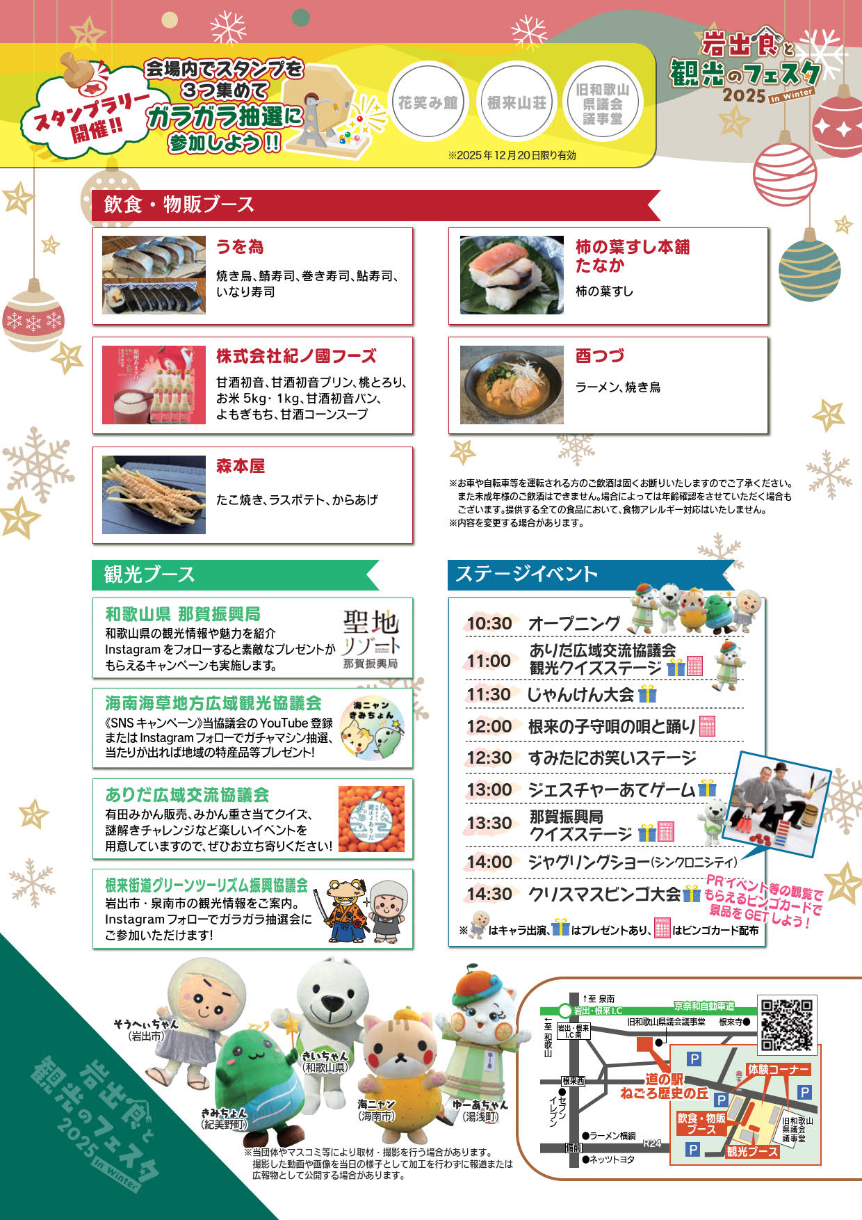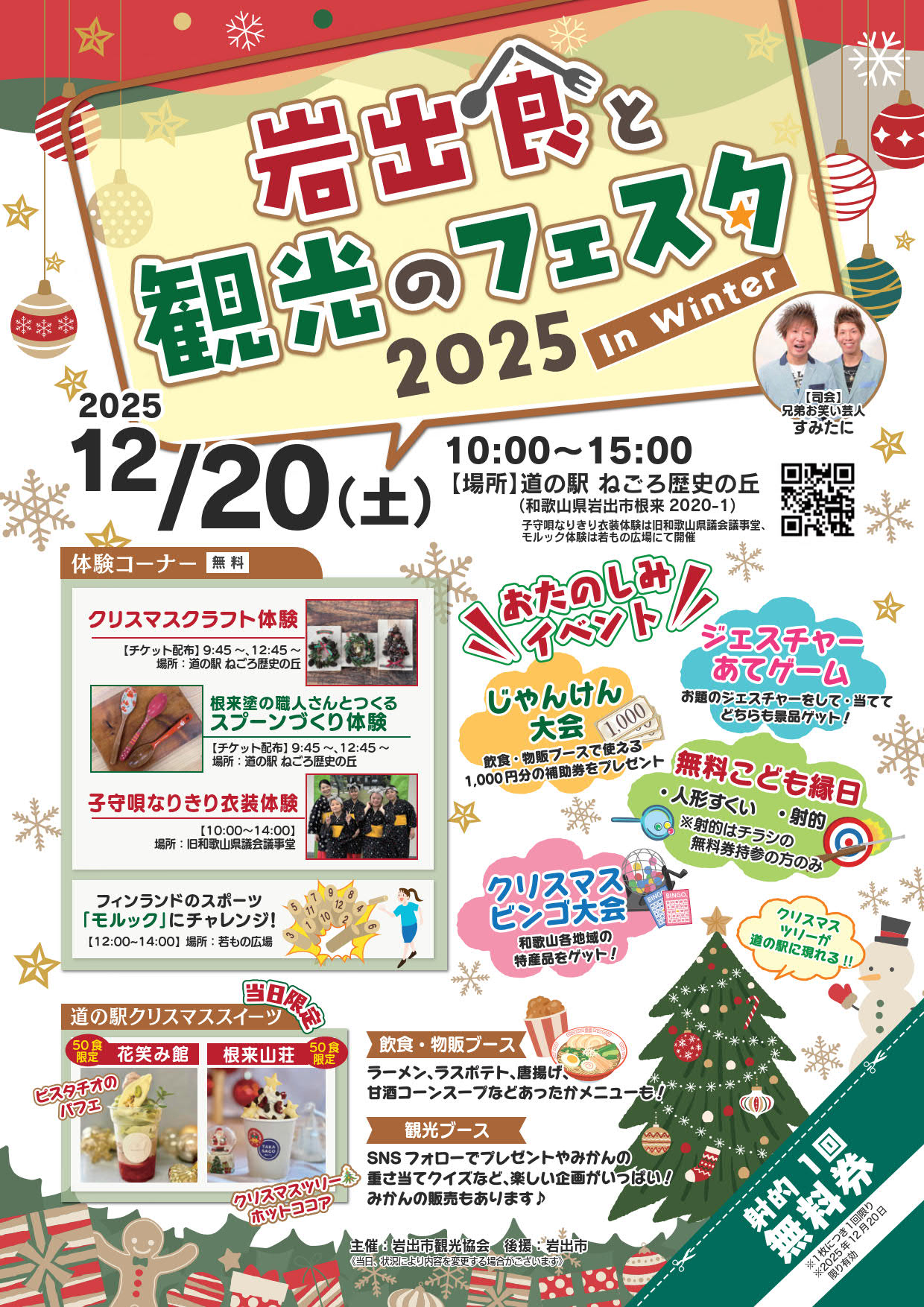 - 岩出市観光協会は、地域と食の魅力を一度に楽しめる「岩出 食と観光のフェスタ2025 In Winter」を 2025年12月20日(土)に道の駅ねごろ歴史の丘で開催します。